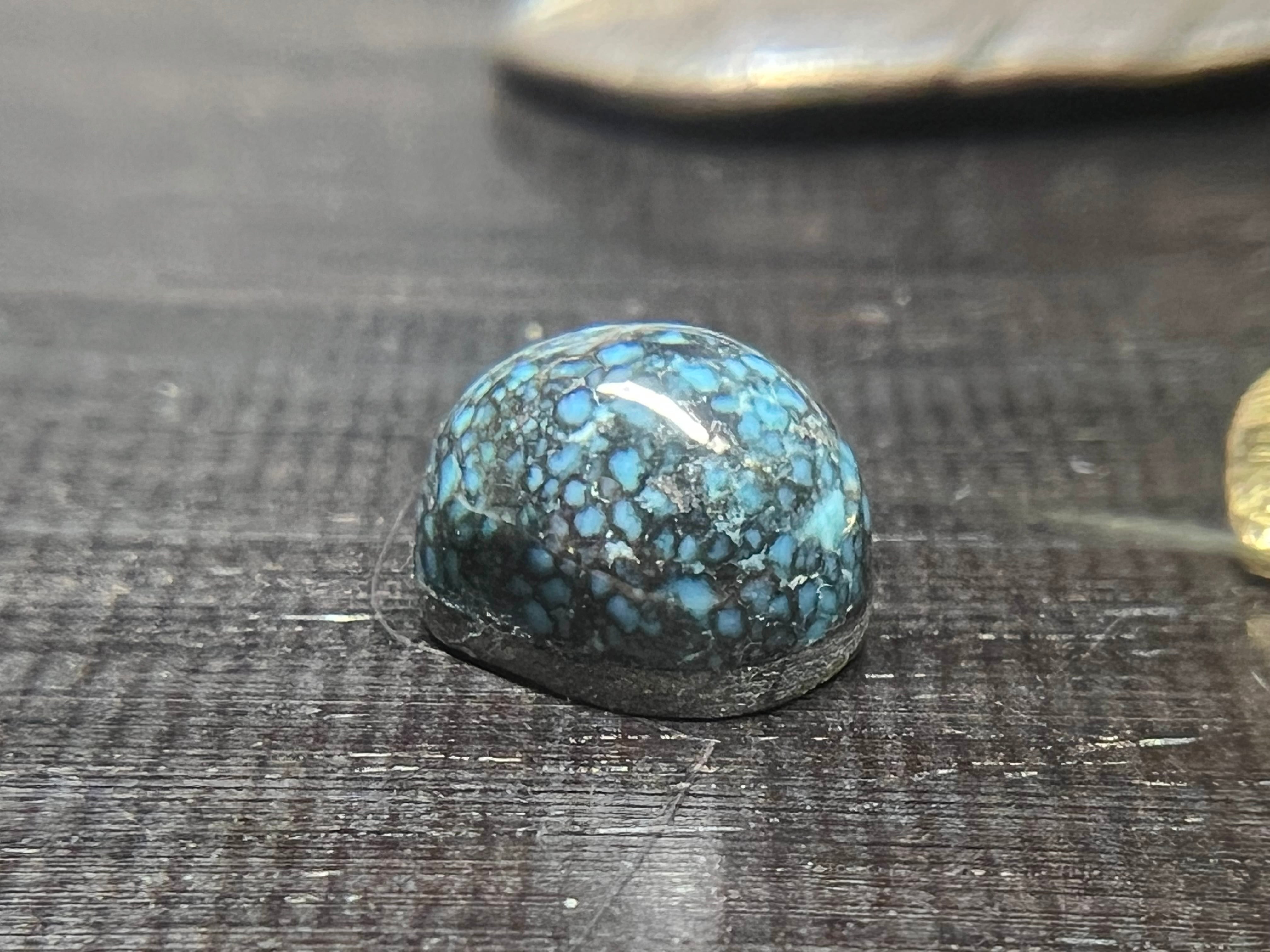 ナチュラル(ノートリートメント ノーエンハンスメント)。光沢のある濃いターコイズブルーにランダーブルー の特徴であるMicro Webブラックマトリクスが均一に入り、全体的に艶やかで硬度の高い極上のピースです。リング、ペンダントトップにに映えるサイズだとと思います。厚みがあるピースですので存在感抜群です。