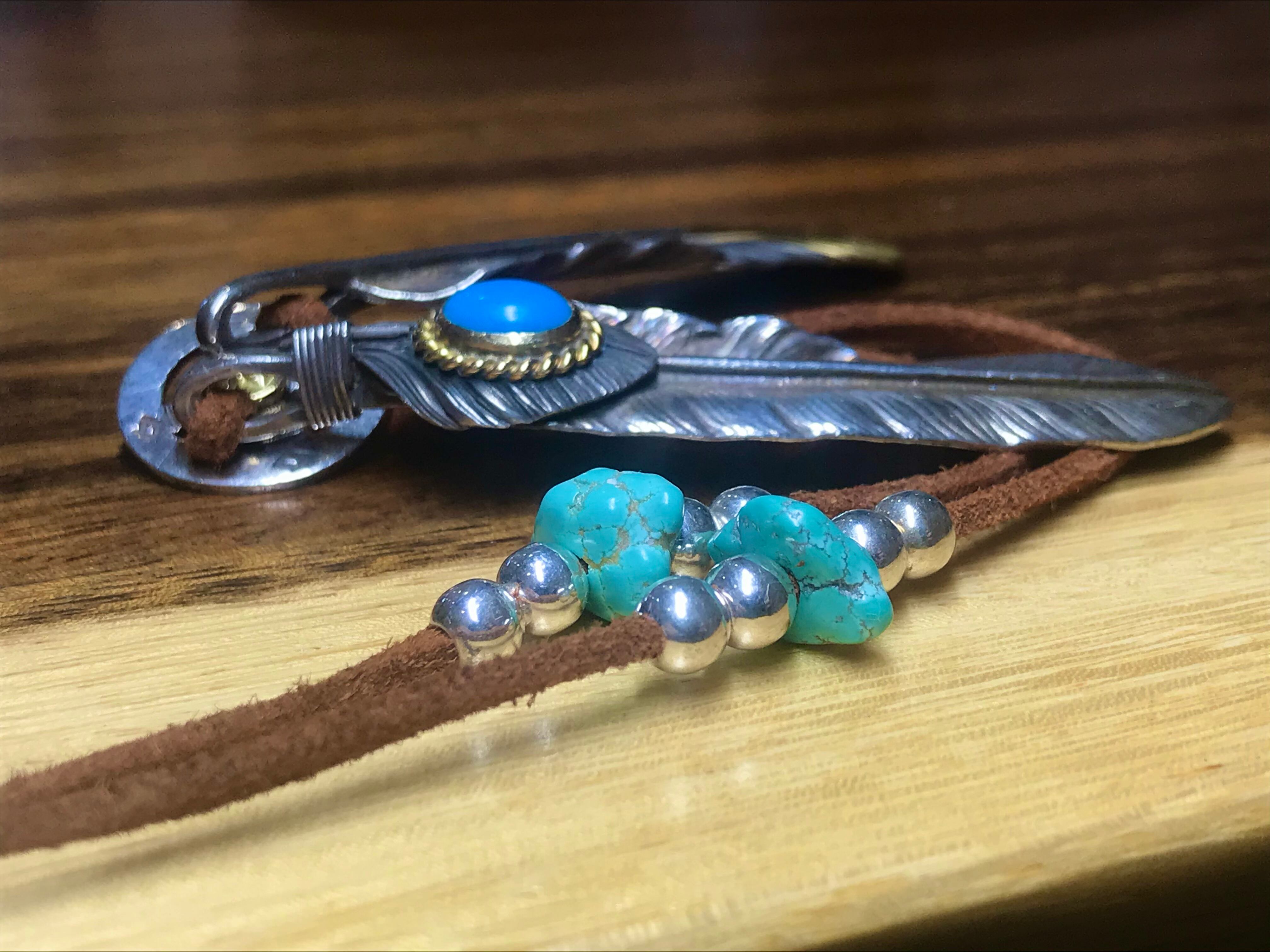 ターコイズビーズの穴は約1.5-2.0mm、一般的な革紐が通るサイズです。